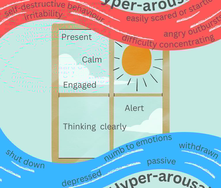 Pažvelkime į tolerancijos lango žemėlapį iš arčiau. Tolerancijos langą sudaro trys zonos: sužadinimo, komforto ir slopinimo. Komforto zonoje gebame valdyti emocijas ir elgesį, jaučiame vidinę harmoniją ir emocijų pusiausvyrą. Sužadinimo būsena – tai pasirengimo „bėgti-kovoti“ būsena. Atsidūrę šioje būsenoje jaučiame nerimą, chaotiškumą, priešiškumą, galimi pykčio ir agresijos priepuoliai. Be to, gali pasireikšti sutrikęs gebėjimas atsipalaiduoti – galime jaustis tarsi nerandantys sau vietos, gali sutrikti miego, valgymo režimas. Taip pat gali pasireikšti įkyrios, pasikartojančios mintys. Kartu su anksčiau išvardintais simptomais gali pasireikšti valgymo sutrikimai bei įvairios priklausomybės.
